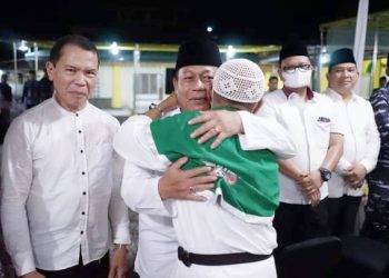 TANJUNGBALAI Plt Wali Kota Tanjungbalai H Waris Tholib didampingi Plt Ketua TP-PKK Hj Fatiah Haitami Waris, Kemenag Tanjungbalai, Jajaran Pemkot Tanjungbalai serta para keluarga menyambut kepulangan jamaah haji asal Kota Tanjungbalai dari...