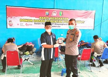 TANJUNG BALAI Kapolres Tanjung Balai AKBP Triyadi SH, SIK diwakili Wakapolres Kompol H. Jumanto SH memimpin pelaksanaan kegiatan aksi donor darah dalam rangka menyambut Hari Bhayangkara ke 76 dan Hari Kesatuan Gerak...
