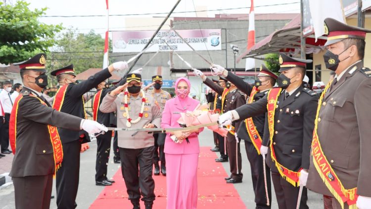AKBP Ahmad Yusuf Afandi SIK. MM bersama Istri Ny. Vera Yusuf Afandi didampingi AKBP Triyadi SH. SIK bersama Istri Ny. Rika Triyadi disambut Tradisi Pedang Pora, kemudian perkenalan dengan Waka Polres Tanjungbalai, PJU, Para Kapolsek, Perwira dan Personel Polres Tanjung balai.