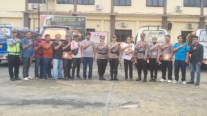 Kapolres Pematangsiantar AKBP Sah Udur TM. Sitinjak SH. SIK. MH didampingi Kasat Lantas IPTU Friska SH menyerahkan hadiah kepada angkutan kota (Angkot) yang meraih juara dalam Lomba Pantun Tertib Berlalu Lintas bertempat di Lapangan Apel Mako Polres Pematangsiantar, pada hari Rabu (30/4/2025) pagi sekira pukul 09.30 Wib.
