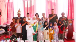 Kapolres Pematangsiantar AKBP Sah Udur T.M. Sitinjak SH. SIK. MH dan Kapolsek Siantar Utara AKP Jahrona Sinaga SH dan Forkopimca photo bersama anak yatim piatu