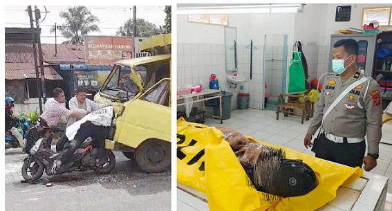 Jenajah korban Muhammad Wira Utama saat masih terjepit diatas sepedamotornya di TKP dan Kanit Gakkum IPTU Ellon Sitinjak SH melihat kondisi jenajah korban diruangan jenajah RSUD dr Djasamen Saragih Kota Siantar