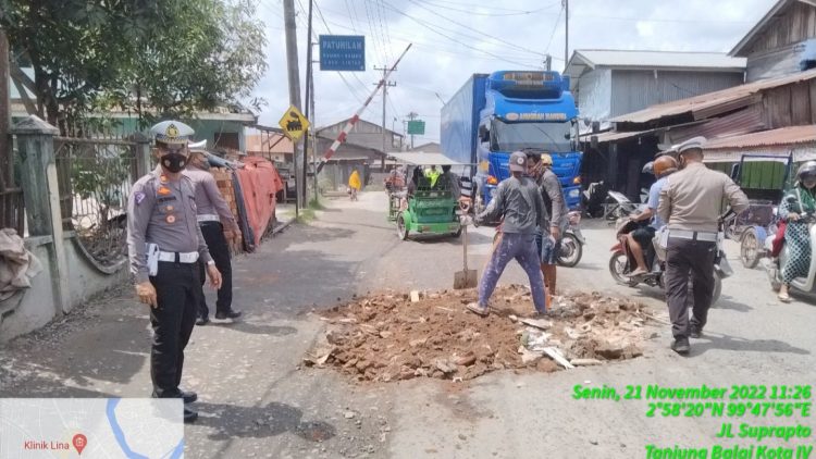 Dipimpin Kepala Satuan Lalulintas (Kasat Lantas) Polres Tanjungbalai AKP HW Siahaan SH melakukan penimbunan jalan berlobang di Jalan Jamin Ginting/Alteri Simp. Al Amin, Perlintasan Kereta Api dan Simp. Menara Lima Kota Tanjung Balai, Sumut, Senin (21/11/2022) sekira pukul 11.00 Wib siang.